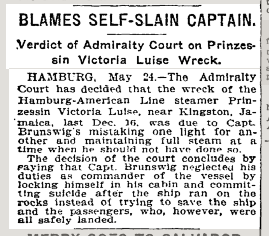 Alors qu'aucun des passagers n'a encore été évacué, à peine 10 minutes après l'échouage, le capitaine se retire dans sa cabine. Il est retrouvé 2 heures plus tard par le premier officier avec une balle dans la tête. L'officier dissimule aux passagers le drame, et cache le corps dans la salle de bain. Ah ? Une enquête expéditive concluera au suicide, et le capitaine sera condamné post-mortem quelques mois plus tard par la justice allemande pour manquements dont le fait de s'être lui-même enfermé dans sa cabine. Ah...