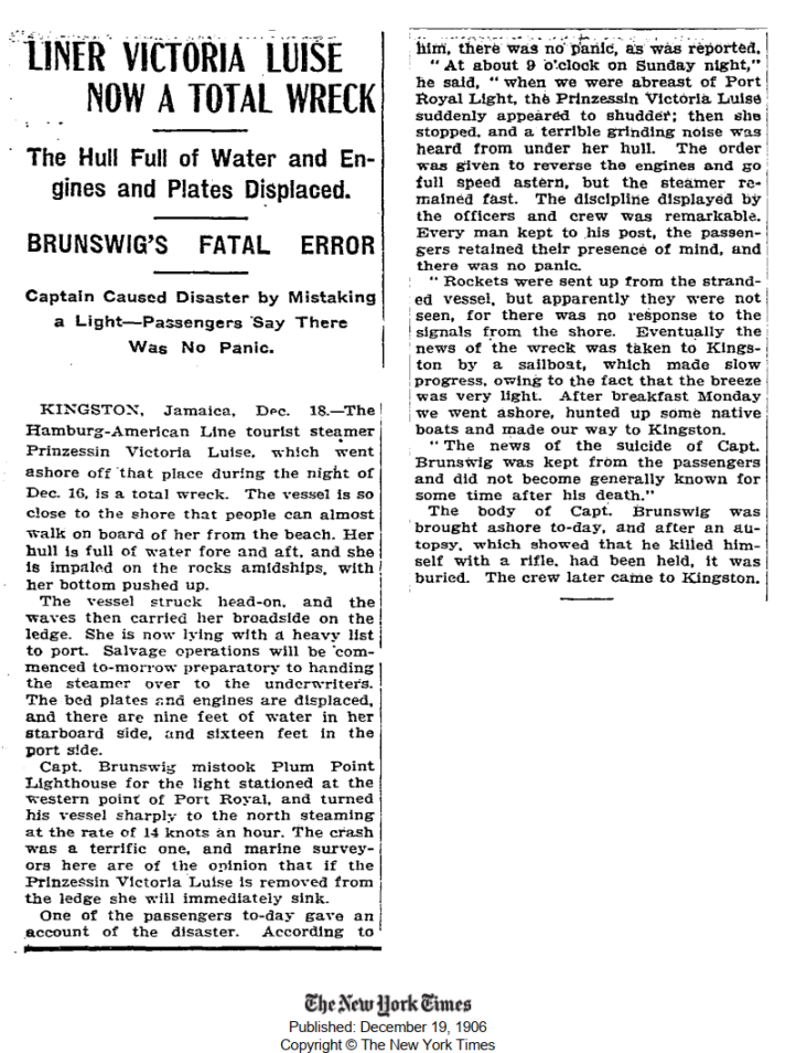 La dernière croisière débute à New-York le 12 décembre 1906, vers Kingston en Jamaïque.